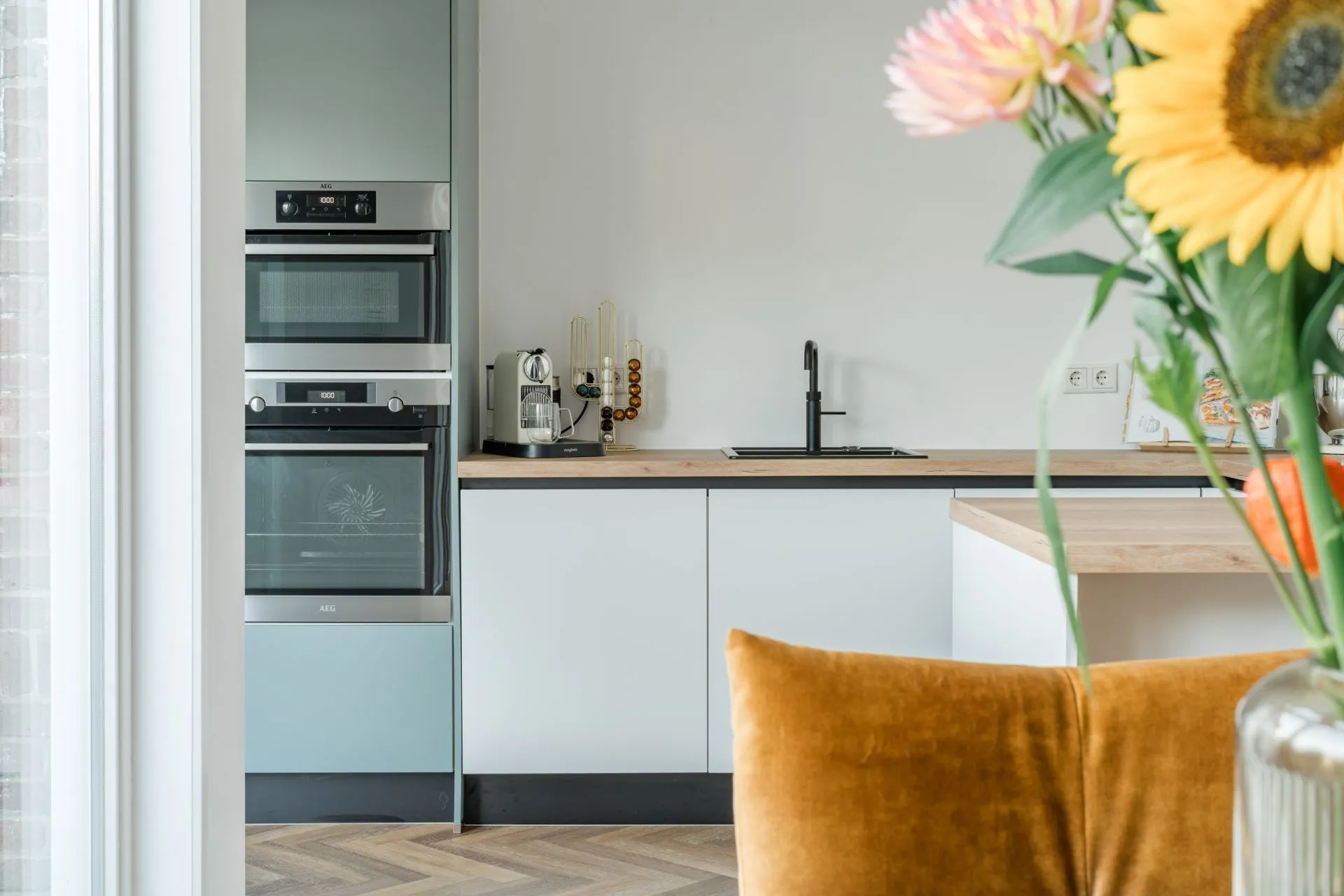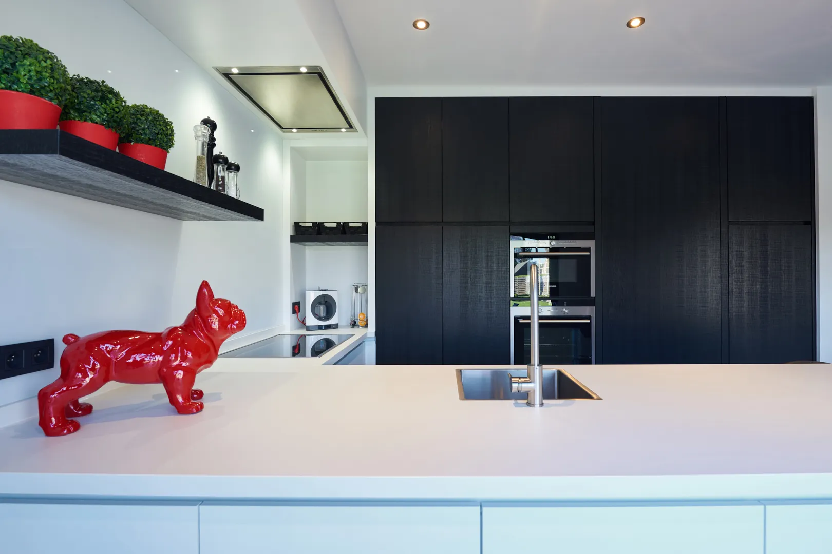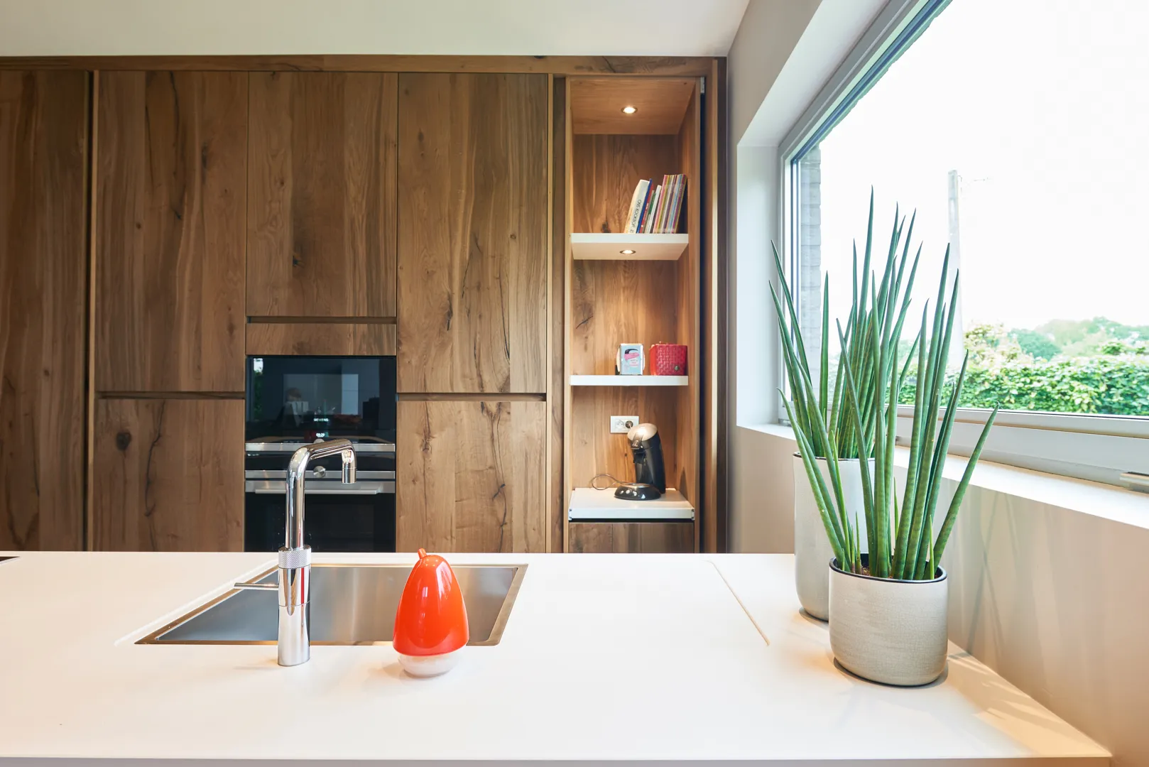 Een voorbeeld hiervan zijn Jo en Val, samen met hun hebben we gepuzzeld om zo hun droomkeuken met alles er op en er aan te kunnen realiseren. Ze hadden een leuke, frisse keuken voor ogen, maar er moest ook rekening gehouden worden met functionaliteit. Zo moest er een wasmachine in de keuken verwerkt worden en willen ze graag de werkruimte optimaal benutten, daarom hebben we gekozen voor een heet-waterkraan, op deze manier staat er toch weer een toestel minder op het aanrecht. Rekening houdend met al deze factoren zijn we tot een mooi eindresultaat gekomen.